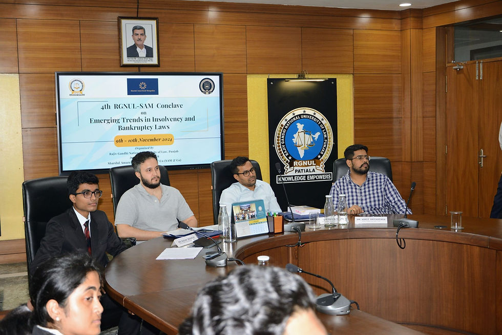 RGNUL Financial and Mercantile Law Review in collaboration with Shardul Amarchand Mangaldas & Co., proudly hosted the 4th RGNUL-SAM Conclave Expert panel Discussion on November 9th 2024. This year’s conclave showcased a remarkable standard of discussion and thought leadership on 𝐄𝐦𝐞𝐫𝐠𝐢𝐧𝐠 𝐓𝐫𝐞𝐧𝐝𝐬 𝐢𝐧 𝐈𝐧𝐬𝐨𝐥𝐯𝐞𝐧𝐜𝐲 𝐚𝐧𝐝 𝐁𝐚𝐧𝐤𝐫𝐮𝐩𝐭𝐜𝐲 𝐋𝐚𝐰𝐬.